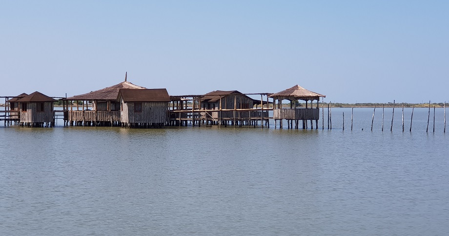 Pescadores remangados en la marisma y casas de madera flotantes sobre la laguna